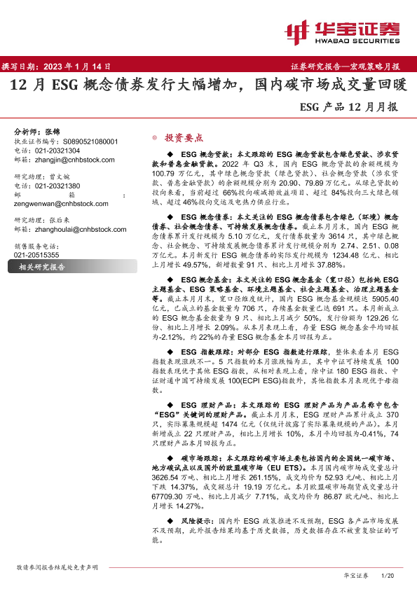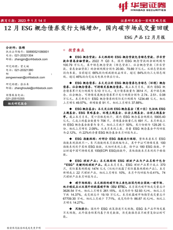 【华宝证券】【20230114】ESG产品12月月报:12月ESG概念债券发行大幅增加,国内碳市场成交量回暖-20页