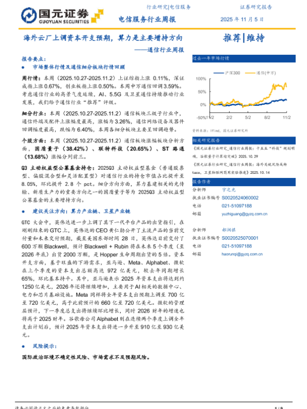 【国元证券】【202511】海外云厂上调资本开支预期,算力是主要增持方向——通信行业周报-9页