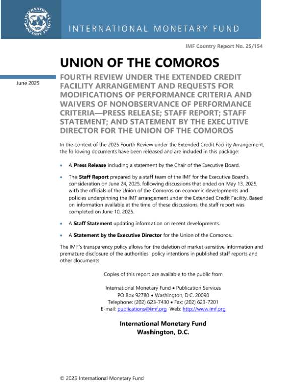 【国际货币基金组织】【202506】Union of the Comoros Fourth Review under the Extended Credit Facility Arrangement and Request for Modifications of Performance Criteria and Waivers of Nonobservance of Performance Criteria—PRESS RELEASE; STAFF REPORT; STAFF STATEMENT; AND STATEMENT BY THE EXECUTIVE DIRECTOR FOR THE UNION OF THE COMOROS-85页