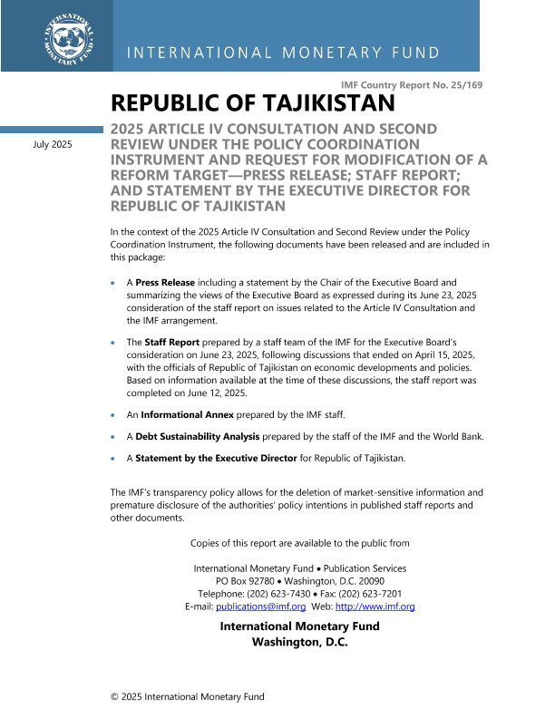 【国际货币基金组织】【202507】REPUBLIC OF TAJIKISTAN—STAFF REPORT FOR THE 2025 ARTICLE IV CONSULTATION AND SECOND REVIEW UNDER THE POLICY COORDINATION INSTRUMENT AND REQUEST FOR MODIFICATION OF A REFORM TARGET-147页