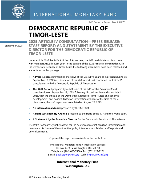 【国际货币基金组织】【202509】Democratic Republic of Timor-Leste 2025 Article IV Consultation-Press Release; Staff Report; and Statement by the Executive Director for the Democratic Republic of Timor-Leste-77页