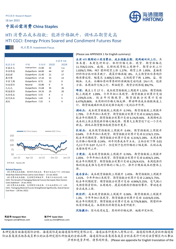 【海通证券】【20230118】中国必需消费行业HTI消费品成本指数:能源价格飙升,调味品期货走高-16页