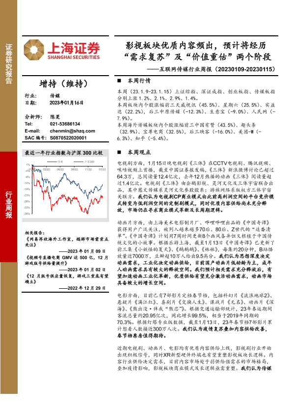 【上海证券】【20230116】互联网传媒行业周报:影视板块优质内容频出,预计将经历“需求复苏”及“价值重估”两个阶段-21页
