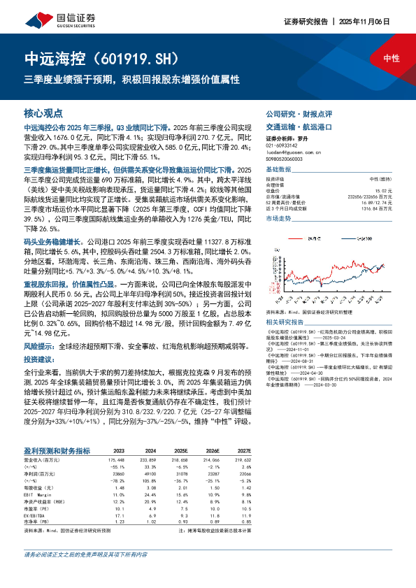 【国信证券】【202511】中远海控(601919.SH)-三季度业绩强于预期,积极回报股东增强价值属性-6页