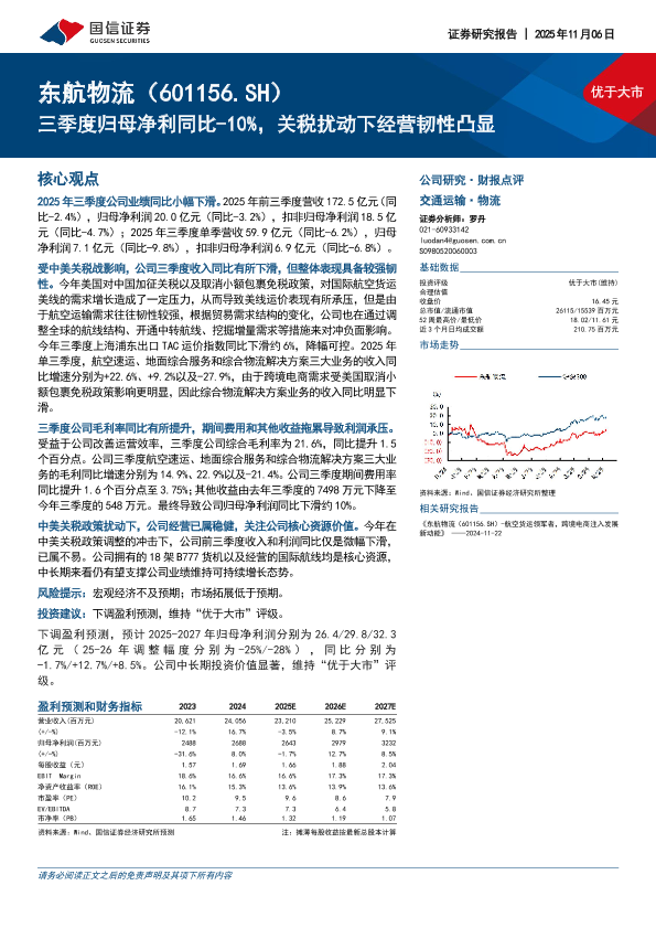 【国信证券】【202511】优于大市 东航物流(601156.SH)三季度归母净利同比-10%,关税扰动下经营韧性凸显-6页