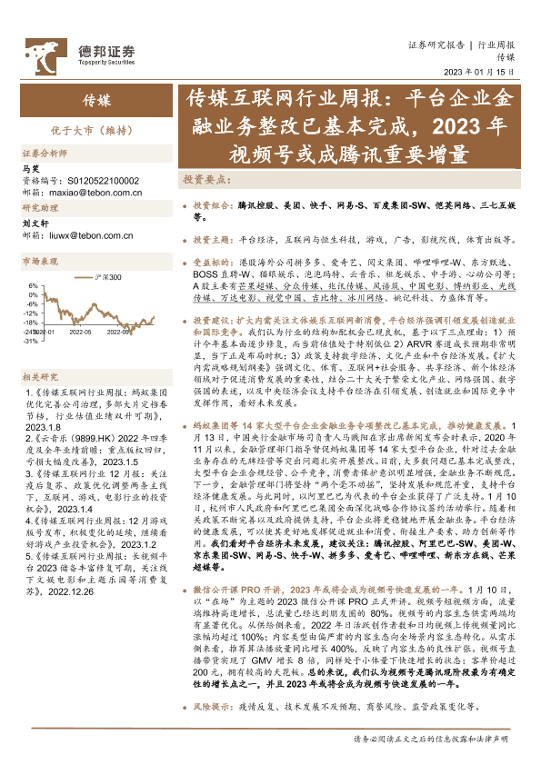 【德邦证券】【20230115】传媒互联网行业周报:平台企业金融业务整改已基本完成,2023年视频号或成腾讯重要增量-17页