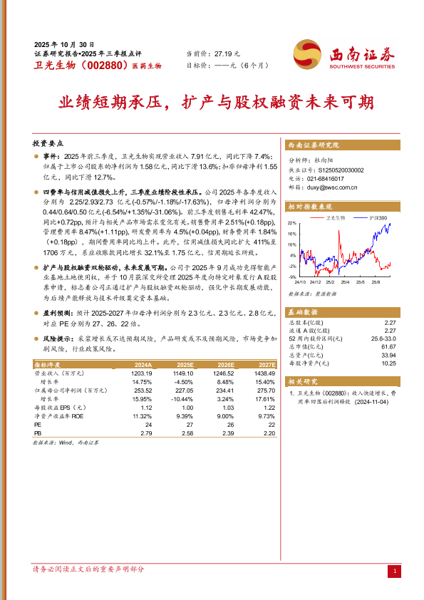【西南证券】【202510】卫光生物(002880):业绩短期承压,扩产与股权融资未来可期-6页