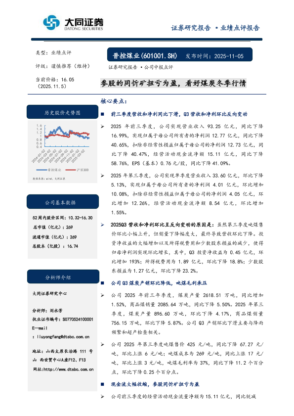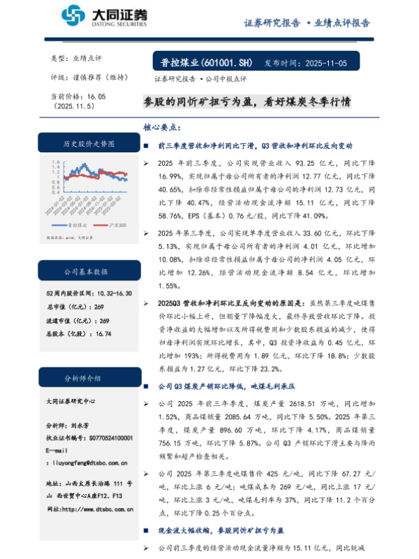 【大同证券研究中心】【202511】参股的同忻矿扭亏为盈,看好煤炭冬季行情-4页