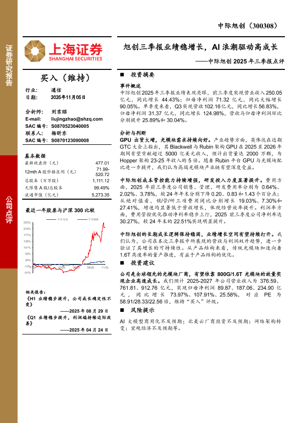 【上海证券】【202511】旭创三季报业绩稳增长,AI浪潮驱动高成长-4页