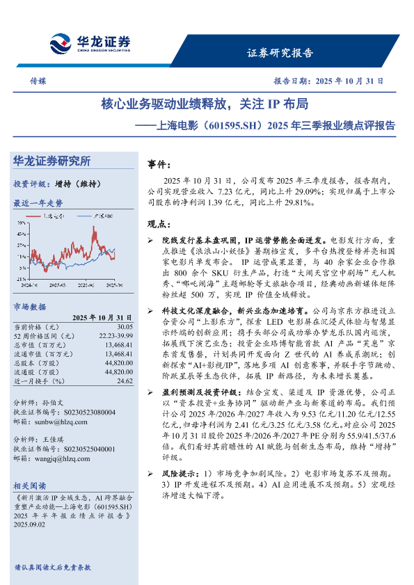 【华龙证券】【2025】核心业务驱动业绩释放,关注IP布局——上海电影(601595.SH)2025年三季报业绩点评报告-4页