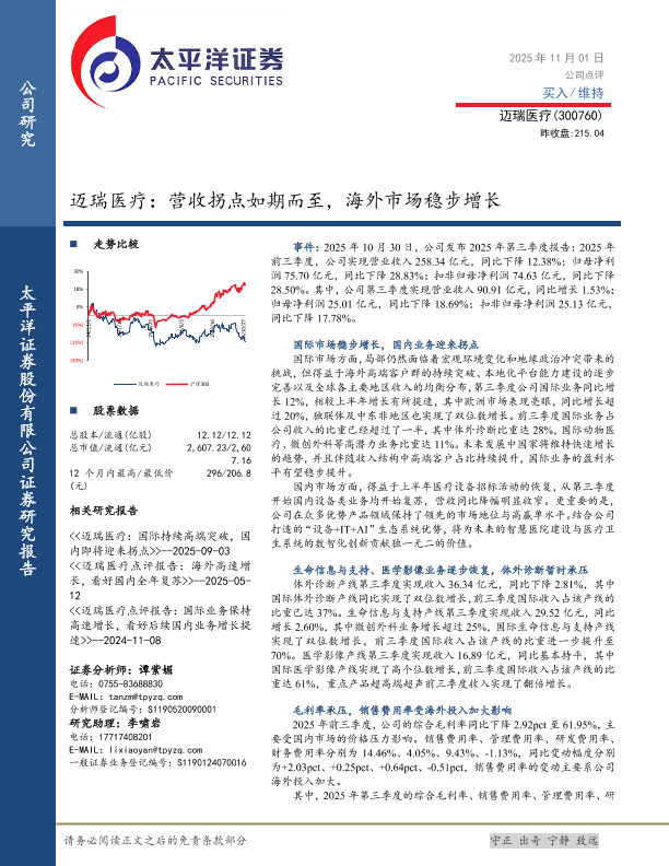 【太平洋证券】【202511】迈瑞医疗:营收拐点如期而至,海外市场稳步增长-5页