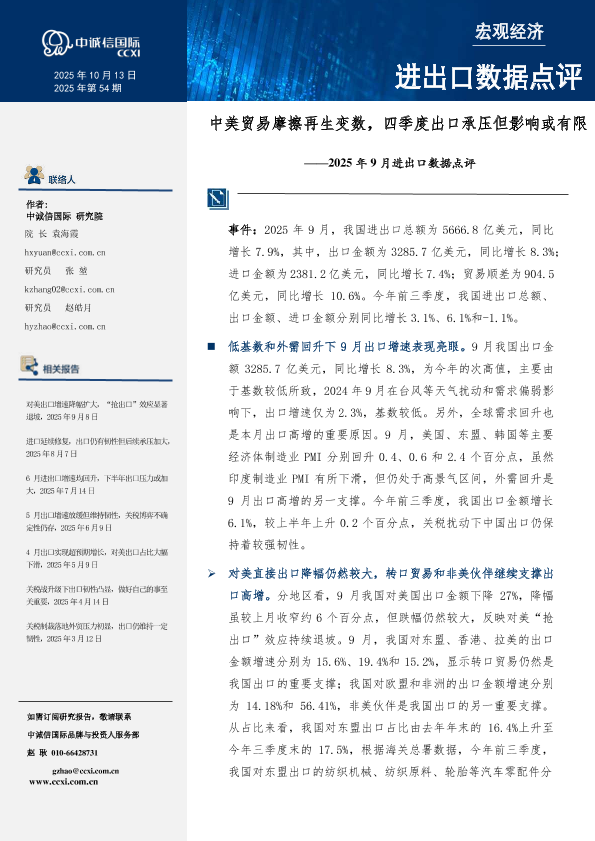 【中诚信国际】【202510】9月进出口数据点评-中美贸易摩擦再生变数,四季度出口承压但影响或有限-7页