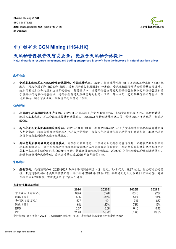 【环球富盛理财有限公司】【202510】中广核矿业(1164.HK) 天然铀资源投资及贸易企业,受益于天然铀价格提升-17页