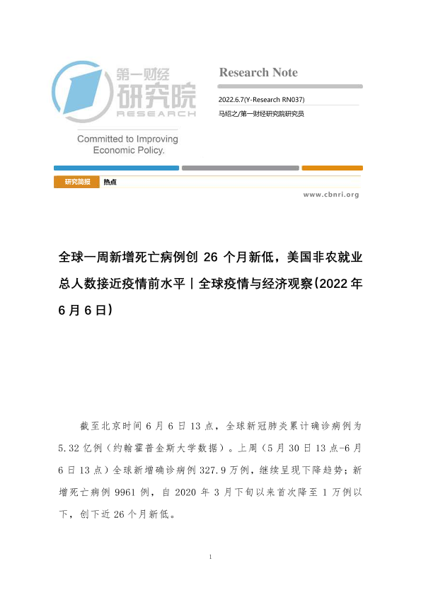【第一财经研究院】【202206】全球一周新增死亡病例创26个月新低,美国非农就业总人数接近疫情前水平丨全球疫情与经济观察(2022年6月6日)-22页