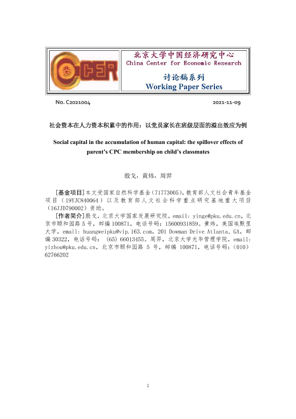 【北京大学国家发展研究院&美国埃默里大学&北京大学光华管理学院】【202111】社会资本在人力资本积累中的作用:以党员家长在班级层面的溢出效应为例-25页