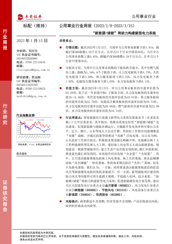 【东莞证券】【20230115】公用事业行业周报:“新能源+储能”将助力构建新型电力系统-14页