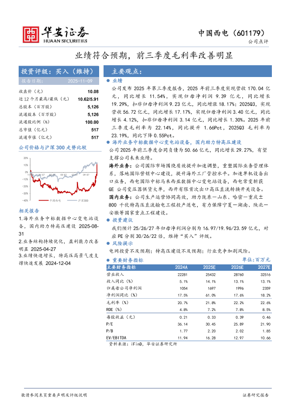业绩符合预期 特高压建设 海外业务拓展 投资评级买入 毛利率改善