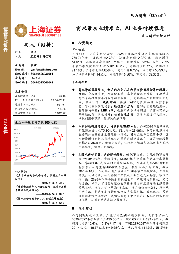 【上海证券】【202511】需求带动业绩增长,AI业务持续推进——东山精密业绩点评-4页