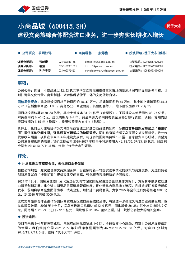 投资评级 进口业务 财务预测 文商旅综合体 义乌商贸城