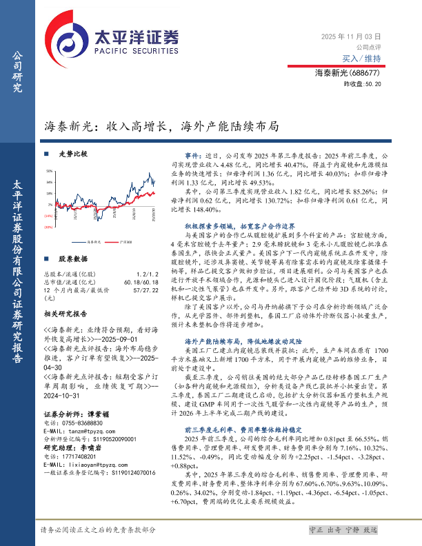【太平洋证券】【202511】海泰新光:收入高增长,海外产能陆续布局-5页