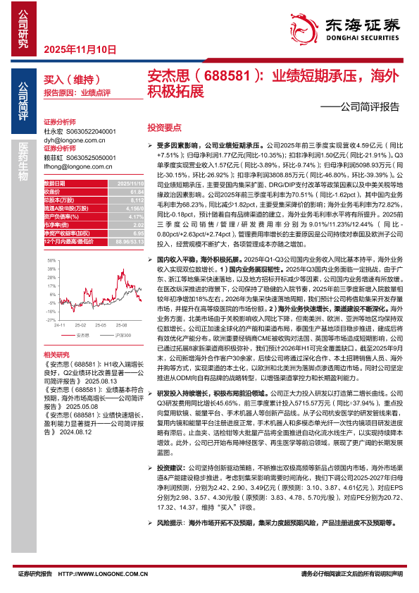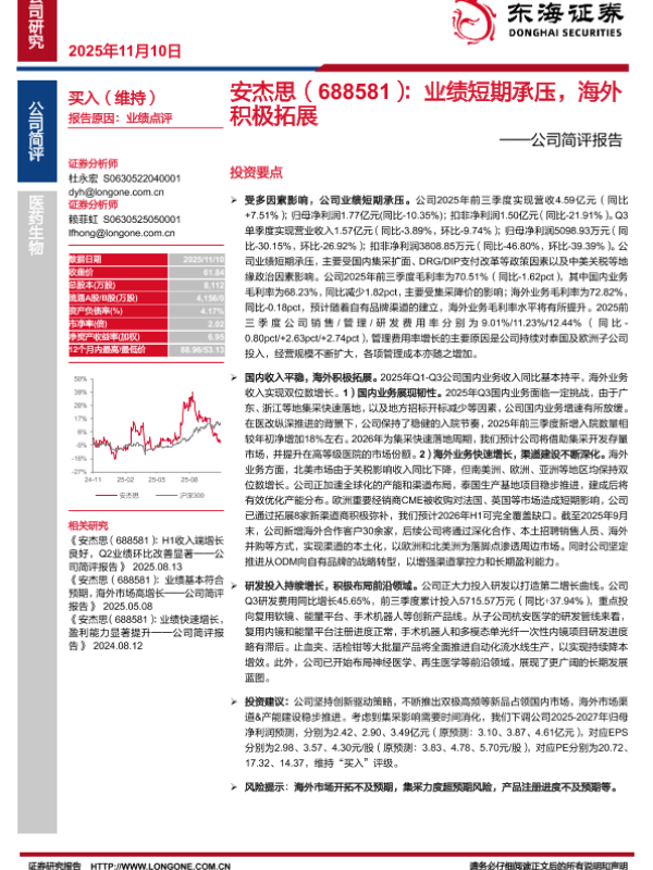 【东海证券】【202511】安杰思(688581):业绩短期承压,海外 积极拓展——公司简评报告-4页