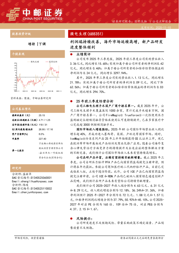 新产品研发 利润改善 微电生理 海外市场 医药生物