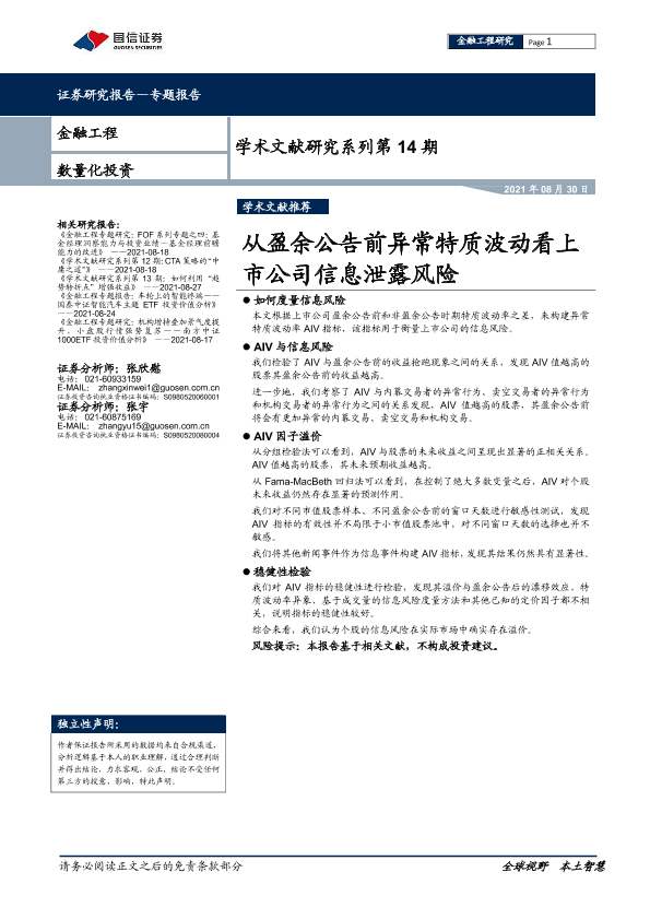 【国信证券】【20210830】学术文献研究系列第14期:从盈余公告前异常特质波动看上市公司信息泄露风险-26页