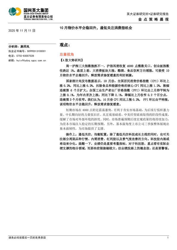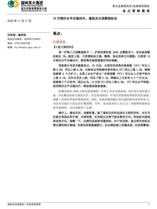 【英大证券】【202511】金点策略晨报:10月物价水平企稳回升,逢低关注消费股机会-4页