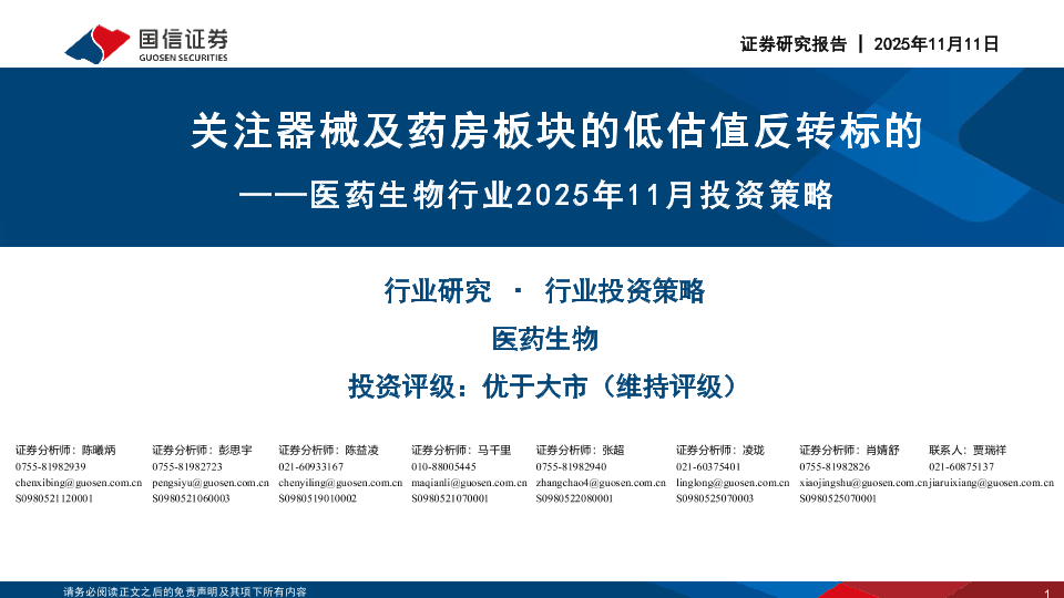 【国信证券】【202511】医药生物行业2025年11月投资策略:关注器械及药房板块的低估值反转标的-36页