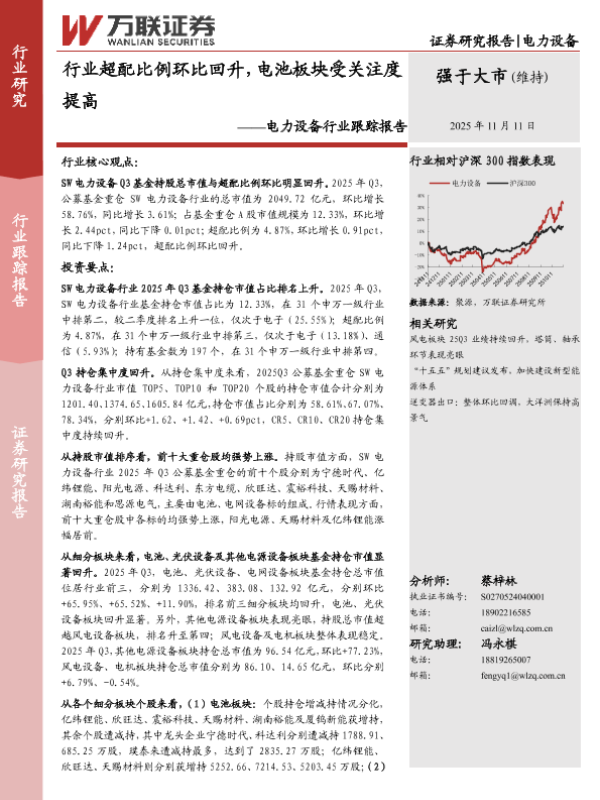电力设备 光伏设备 基金持仓 电池板块 行业分析
