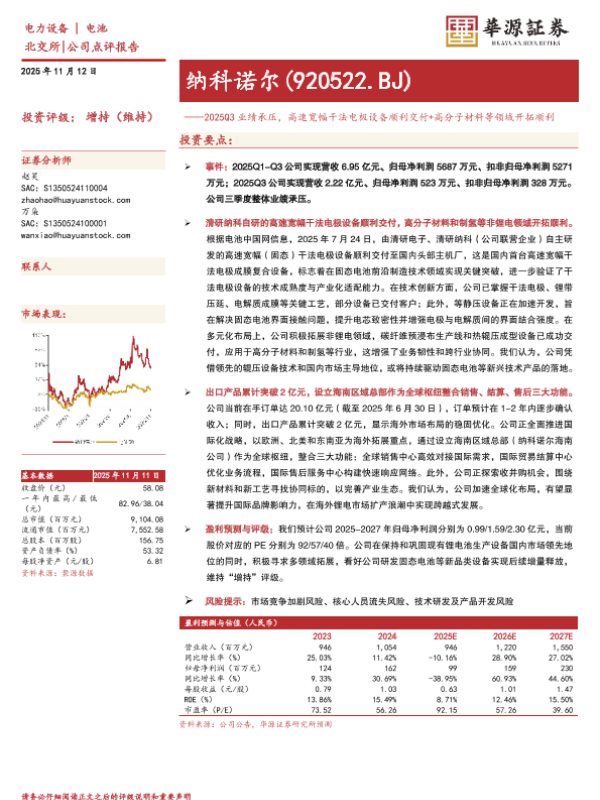【华源证券】【202511】2025Q3业绩承压,高速宽幅干法电极设备顺利交付+高分子材料等领域开拓顺利-3页