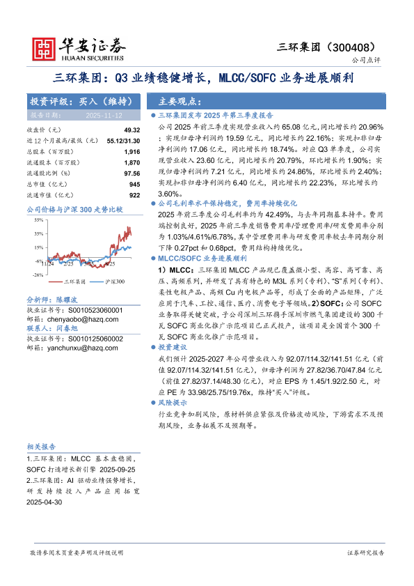 【华安证券】【202511】三环集团:Q3业绩稳健增长,MLCC/SOFC业务进展顺利-4页