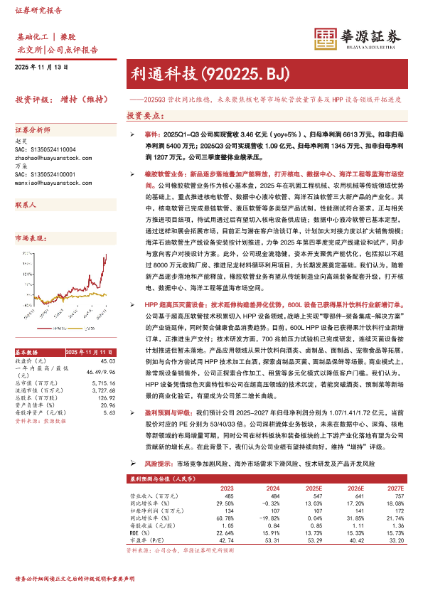 【华源证券】【202511】2025Q3营收同比维稳,未来聚焦核电等市场软管放量节奏及HPP设备领域开拓进度-3页