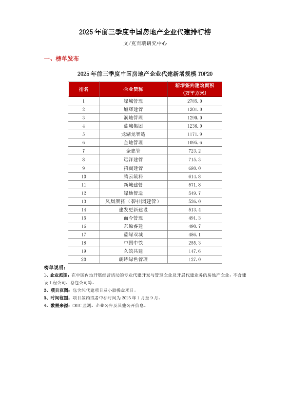 【克而瑞研究中心】【2025】2025年前三季度中国房地产企业代建排行榜-6页