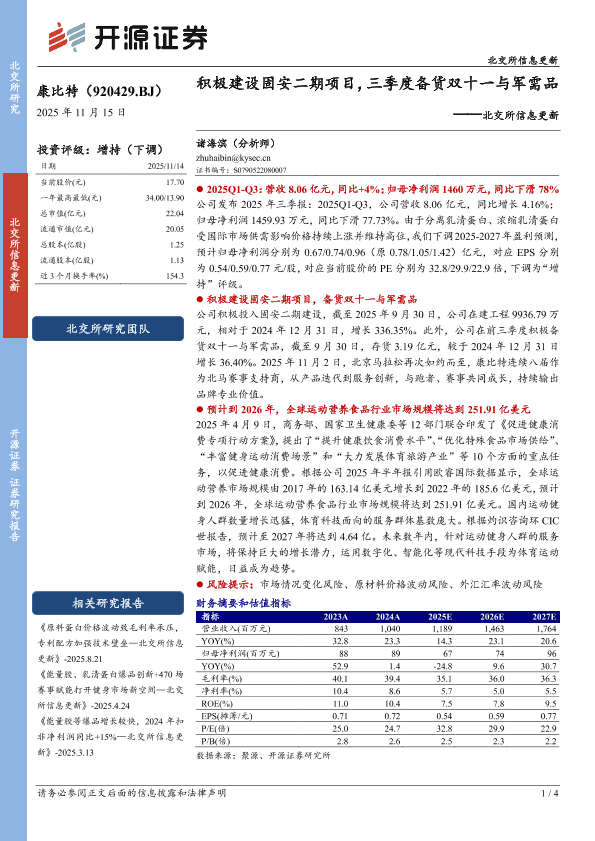 北交所 固安二期项目 军需品 双十一备货 康比特