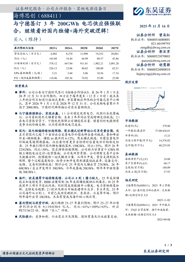 【东吴证券】【202511】海博思创(688411):与宁德签订 3年 200GWh电芯供应强强联合,继续看好国内独储+海外突破逻辑!-3页
