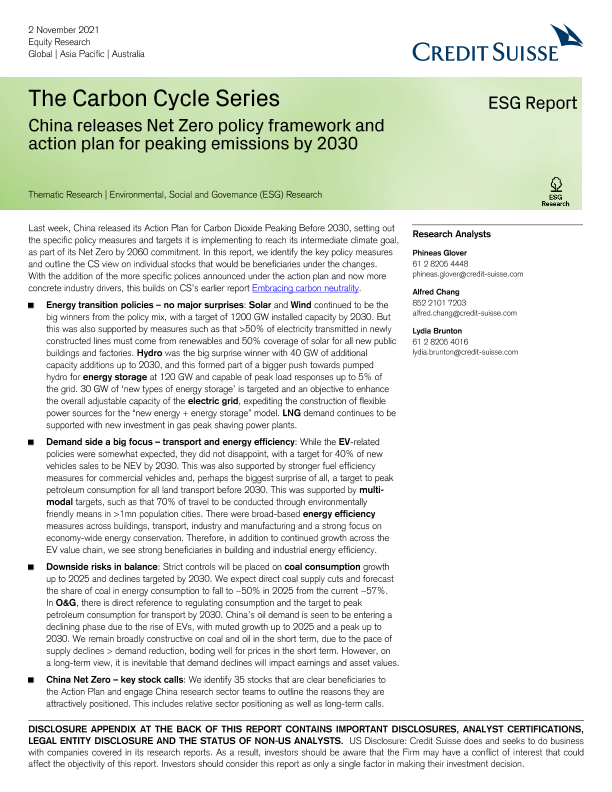 【Credit Suisse】【202111】The Carbon Cycle Series China releases Net Zero policy framework and action plan for peaking emissions by 2030-21页