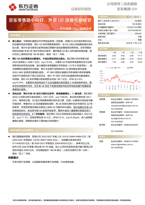 【东方证券】【202511】京东集团25Q3前瞻点评_京东零售稳中向好_外卖UE改善亏损收窄-8页