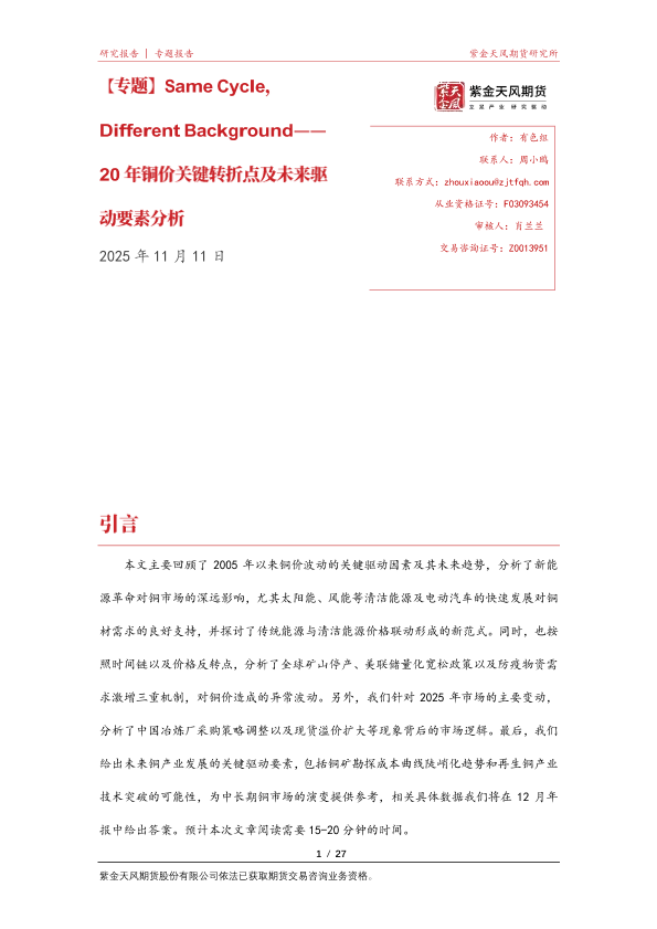 【紫金天风期货】【202511】Same Cycle,Different Background——20年铜价关键转折点及未来驱动要素分析-27页