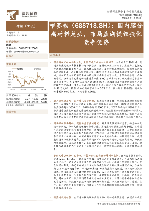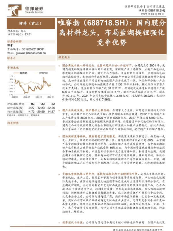 【德邦证券】【20230119】唯赛勃(688718)国内膜分离材料龙头,布局盐湖提锂强化竞争优势-35页