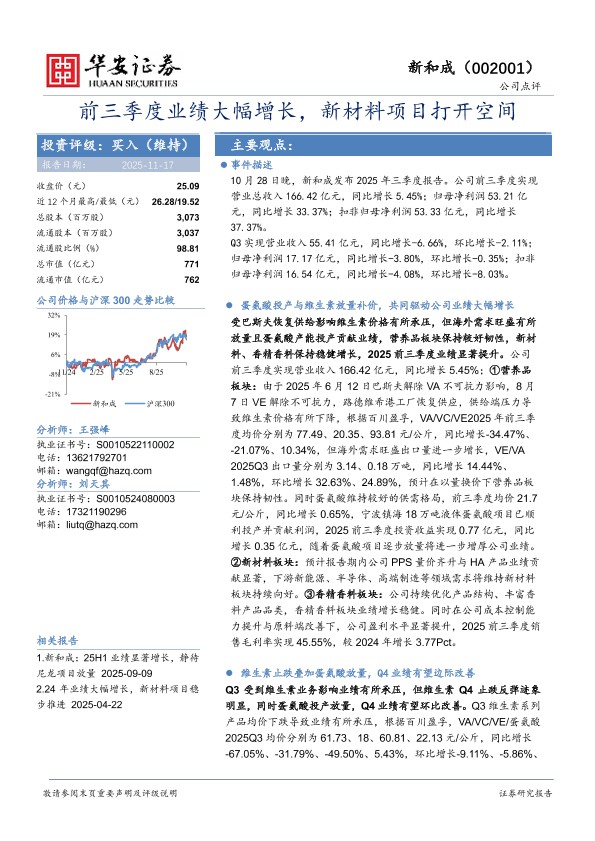 新材料 业绩增长 香精香料 蛋氨酸 维生素