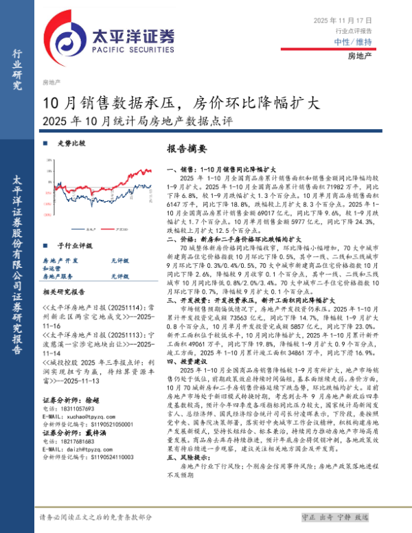 【太平洋证券】【202511】2025年10月统计局房地产数据点评:10月销售数据承压,房价环比降幅扩大-12页