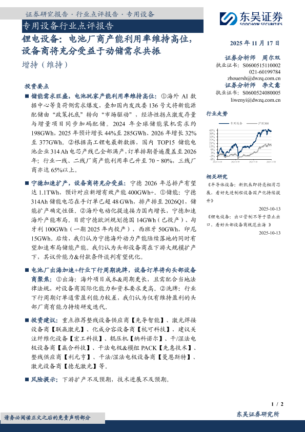 【东吴证券】【202511】专用设备行业点评报告·锂电设备:电池厂商产能利用率维持高位,设备商将充分受益于动储需求共振-2页