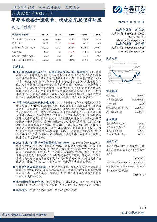 【东吴证券】【202511】半导体设备加速放量,钙钛矿先发优势明显-3页