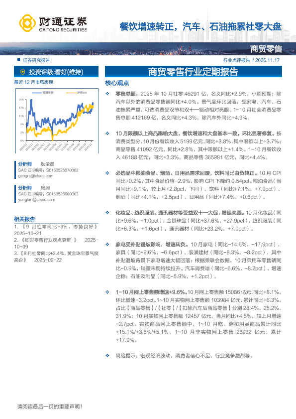 【财通证券】【202511】商贸零售行业定期报告:餐饮增速转正,汽车、石油拖累社零大盘-7页