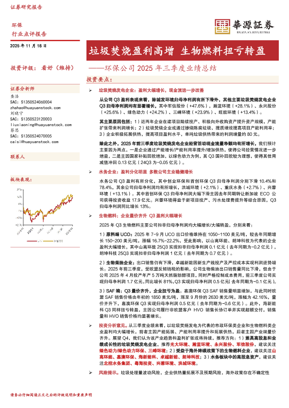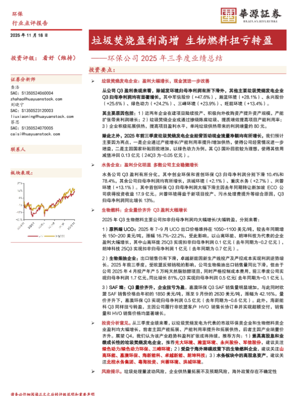 【华源证券】【202511】环保公司 2025年三季度业绩总结——垃圾焚烧盈利高增 生物燃料扭亏转盈-8页