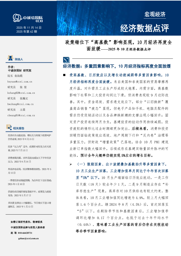 【中诚信国际】【202510】2025年10月经济数据点评:政策错位下“高基数”影响显现,10月经济再度全面放缓-12页