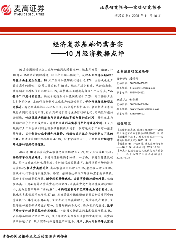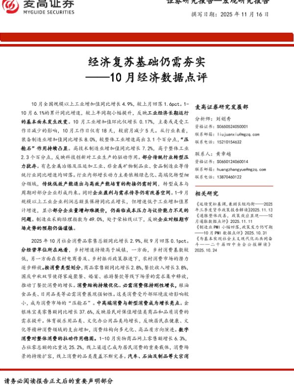 【麦高证券】【202511】经济复苏基础仍需夯实 ——10月经济数据点评-10页