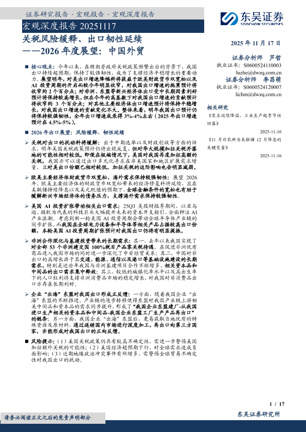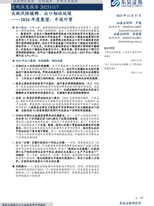 【东吴证券】【202511】关税风险缓释、出口韧性延续 ——2026年度展望:中国外贸-17页