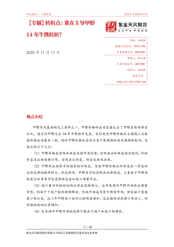【紫金天风期货】【202511】转折点:谁在主导甲醇14年牛熊转折?-10页